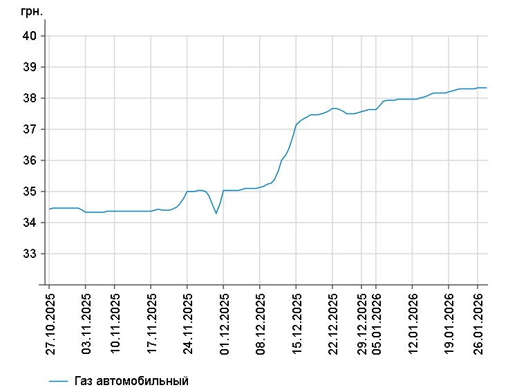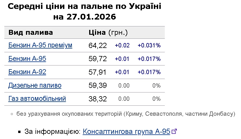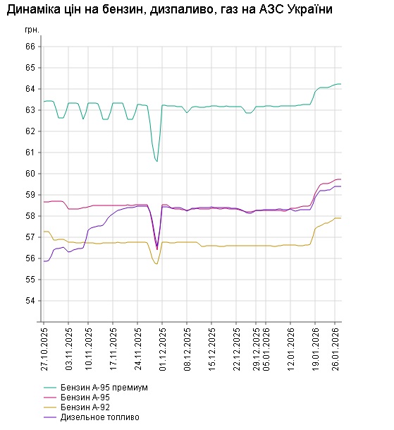 Як повідомлялось, у понеділок, 26 січня, середня ціна на бензин марки А-95 зросла на 15 коп. до 59,71 грн/л, на дизельне пальне - на 15 коп. до 59,39 грн/л.