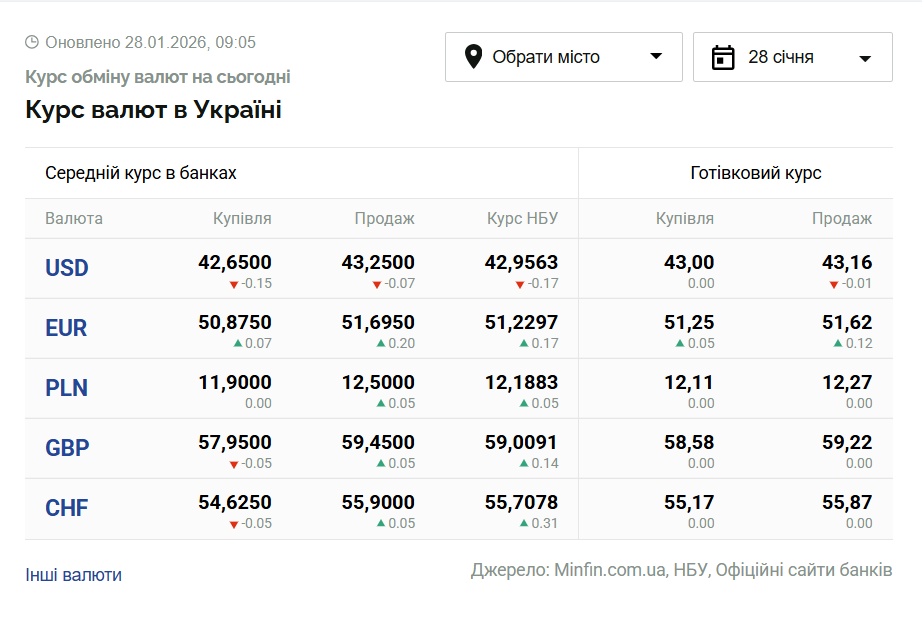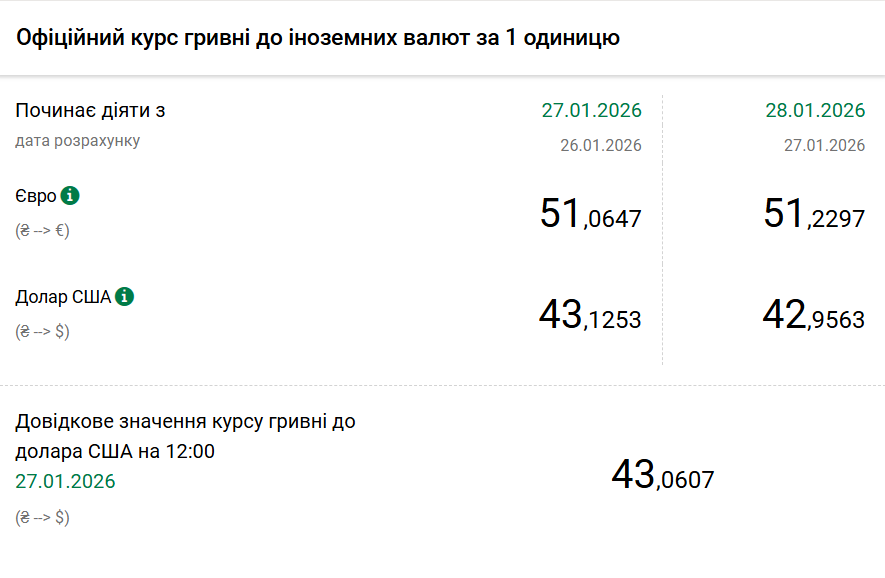 - 1 долар США – 42,95 грн (43,12 грн станом на 27 січня);