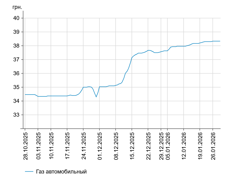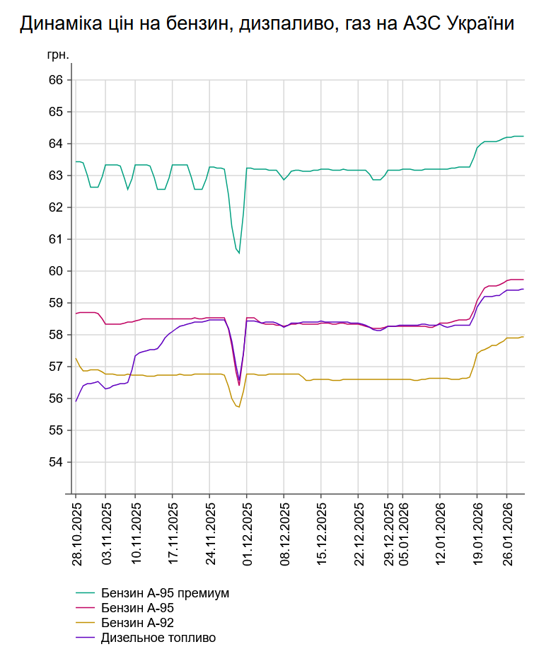 Як повідомлялось, у вівторок, 27 січня, середня ціна на бензин марки А-95 зросла на 1 коп. до 59,72 грн/л, на дизельне пальне - зафіксувалася на рівні 59,39 грн/л.