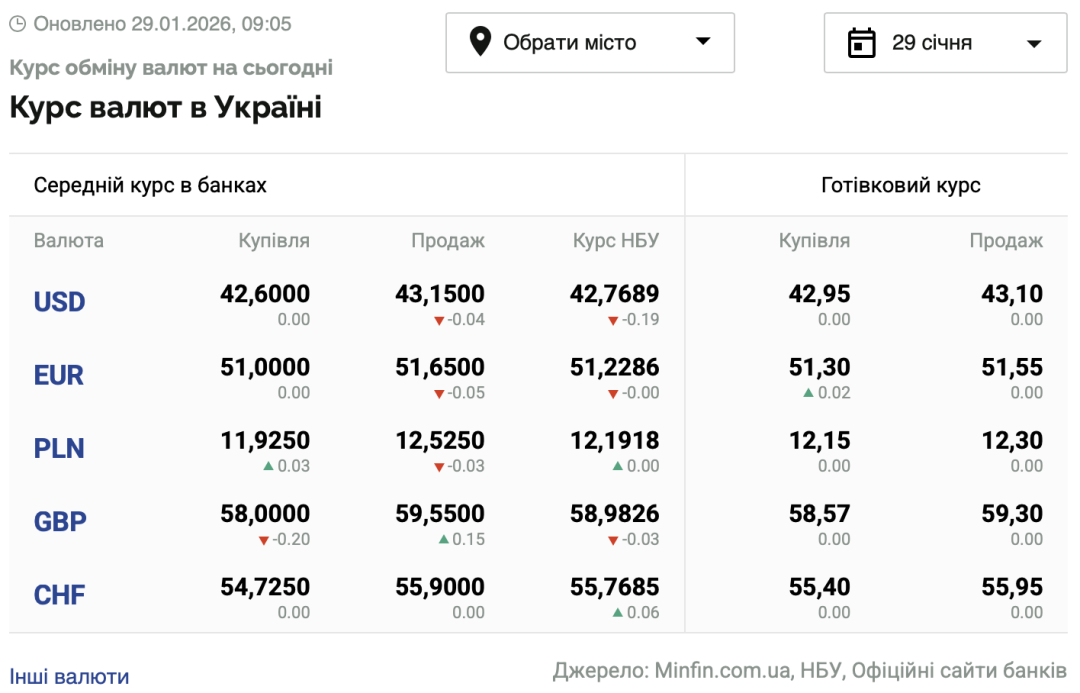 - 1 долар США – 42,76 грн (42,95 грн станом на 28 січня);