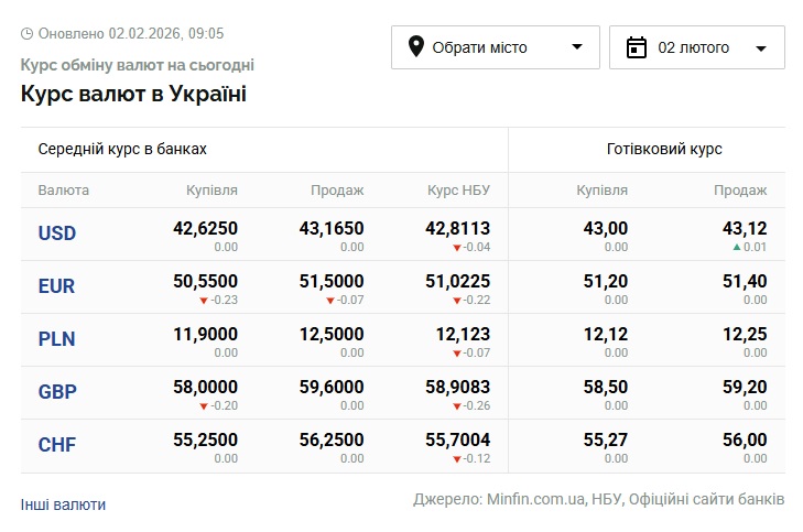 Офіційні курси валют на понеділок, 2 лютого, становлять: