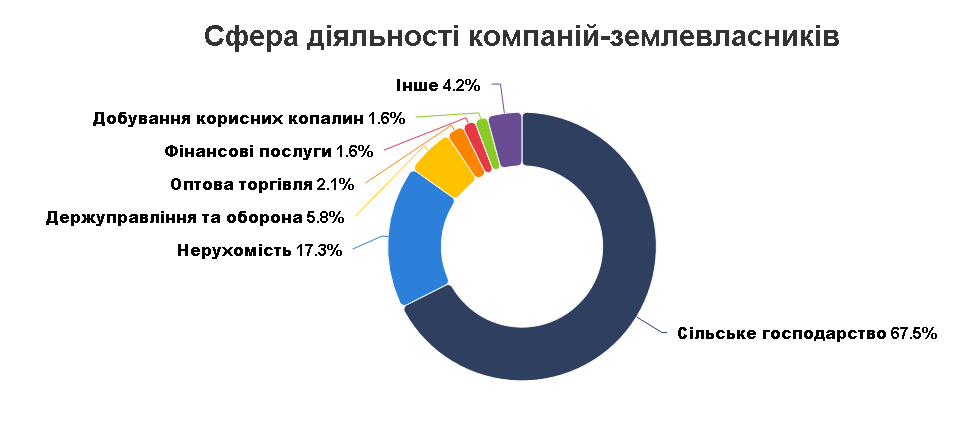 Водночас 67% великих землевласників працює у сфері сільського господарства — 129 компаній. Ще 33 компанії, або 17%, пов’язані з операціями з нерухомістю. У сфері державного управління та оборони працюють 11 компаній, в оптовій торгівлі — 4, у фінансовому секторі — 3 компанії.