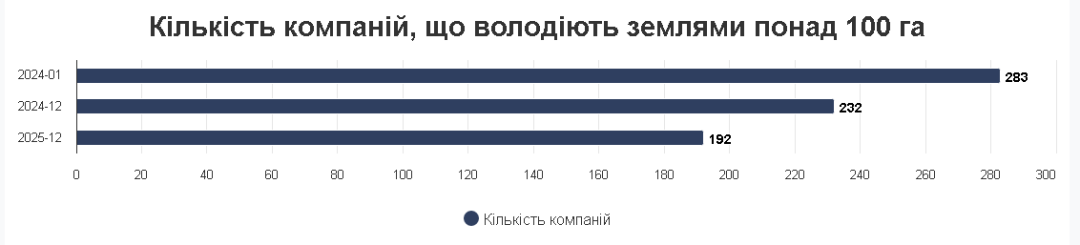 «192 компанії, у власності яких перебуває понад 100 гектарів землі, налічується наразі в Україні. Для порівняння: на момент відкриття ринку землі для юридичних осіб у 2024 таких компаній було 283. На 51 компанію зменшився перелік великих землевласників упродовж 2024 року, а торік — ще на 40 компаній», - йдеться в повідомленні.