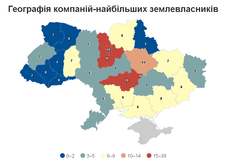 За даними аналітиків, 38 компаній із переліку великих землевласників зареєстровано на Київщині, 28 компаній – у Кіровоградській області і стільки ж — безпосередньо в Києві. Водночас в Івано-Франківській, Рівненській та Чернівецькій областях великі землевласники серед компаній відсутні.