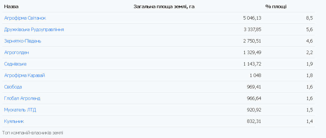 Майже третиною (18,34 тис. га) української землі у власності бізнесу володіють лише 10 компаній.