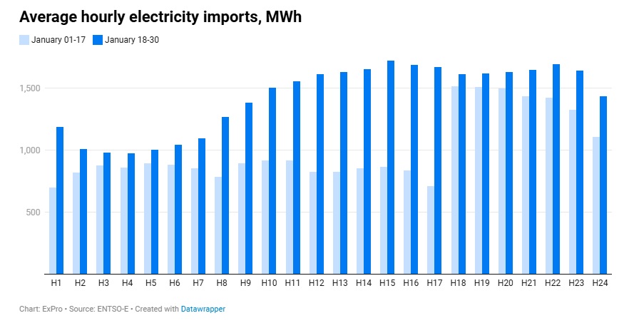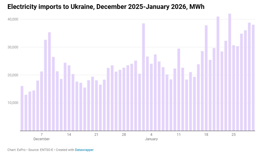 "За розрахунками ExPro, середньодобовий імпорт за цей період зріс на 41% (порівняння за 1-17 січня 2026 року та 18-30 січня 2026 року) - до 33,9 тис. МВт-год. Також, у січні було досягнуто рекордного значення імпорту за добу - 41,9 тис. МВт-год.", - йдеться у повідомленні.