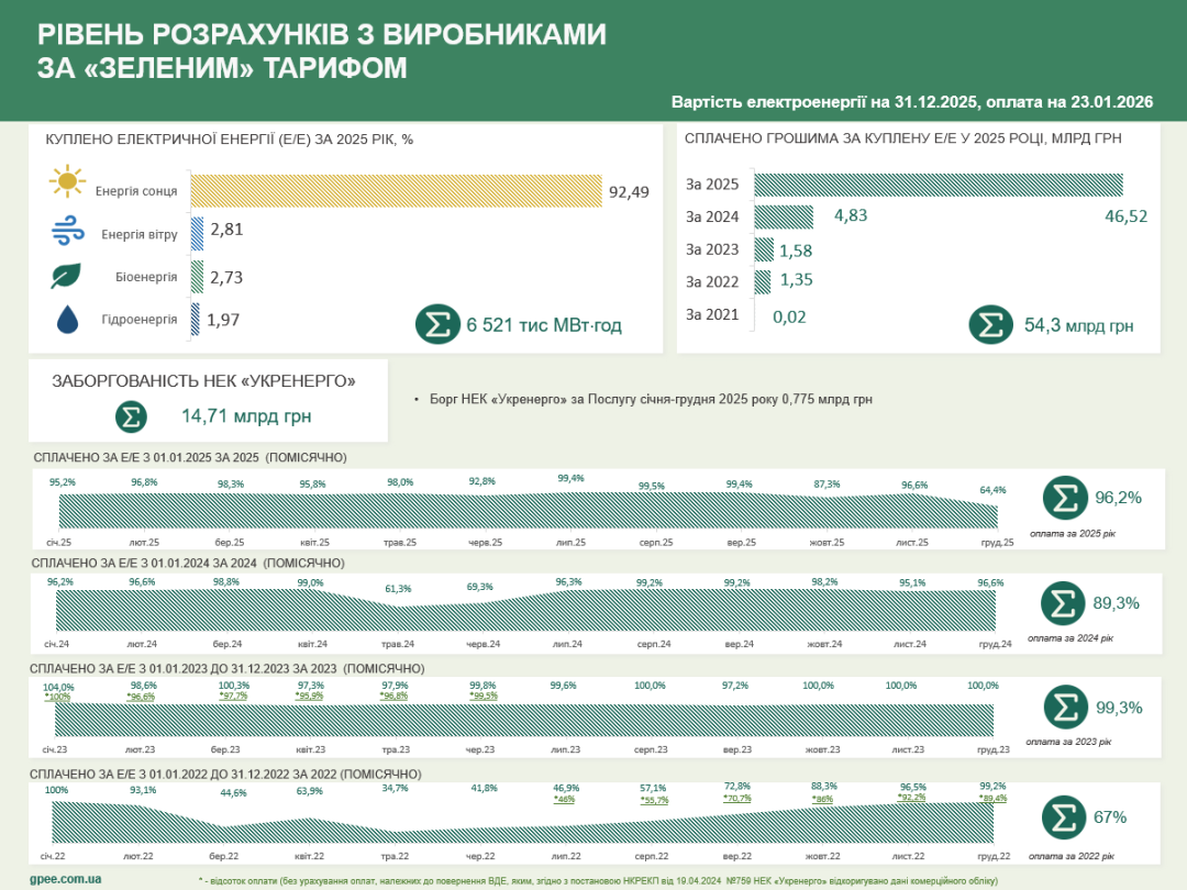 Рівень розрахунків "Гарантованого покупця" з виробниками "зеленої" енергії становить: за 2025 рік - 96,2%, за 2024 рік - 89,3%, за 2023 рік - 99,3%, за 2022 рік - 67%.