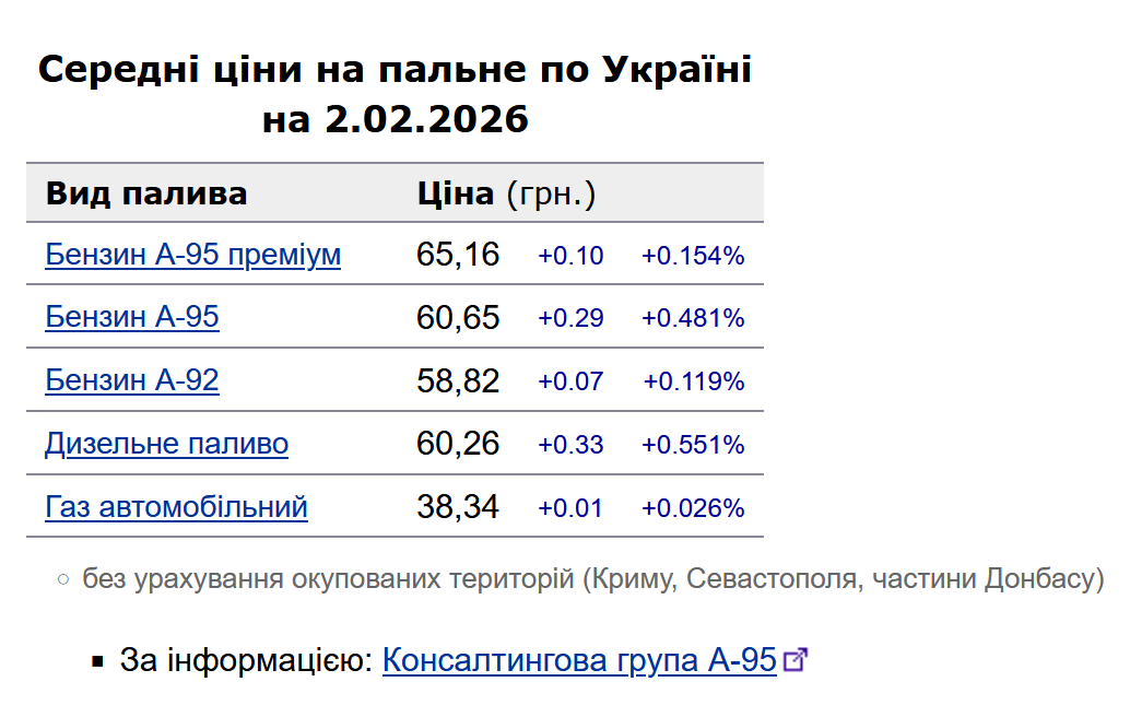 Зокрема, зафіксовано такі середні ціни на пальне: бензин марки А-95 (преміум) - 65,16 грн/л (здорожчав на 10 коп.); бензин марки А-95 - 60,65 грн/л (здорожчав на 28 коп.); бензин марки А-92 - 58,82 грн/л (здорожчав на 7 коп.); дизельне пальне - 60,26 грн/л (здорожчало на 33 коп.). Середня ціна автогазу становить 38,34 грн/л, що на 1 коп. дорожче порівняно із попереднім днем.
