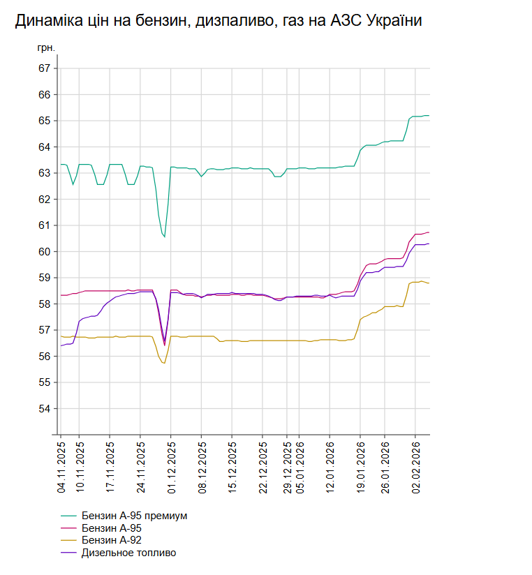 Як повідомлялось, у вівторок, 3 лютого, середня ціна на бензин марки А-95 зросла на 2 коп. до 60,67 грн/л, на дизельне пальне - зафіксувалася на рівні 60,26 грн/л.