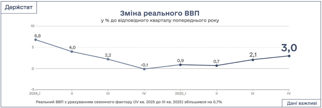 «Реальний ВВП у четвертому кварталі 2025 року збільшився порівняно з попереднім кварталом на 0,7% (з урахуванням сезонного фактору), а порівняно з четвертим кварталом 2024 року - на 3,0%», - йдеться в повідомленні.