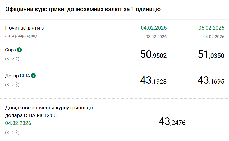 - 1 євро – 51,03 грн (50,95 грн станом на 4 лютого).