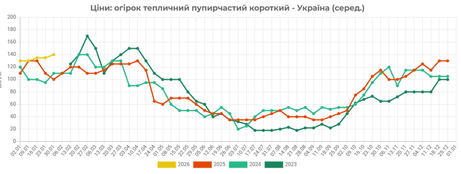 За прогнозами імпортерів, зростання цін на тепличні овочі триватиме щонайменше до кінця лютого, оскільки сезон продажів у більшості українських тепличних комбінатів ще не розпочався. Водночас тепличні огірки в Україні вже в середньому на 54% дорожче, ніж на початку лютого 2025 року.
