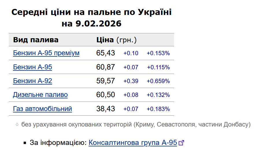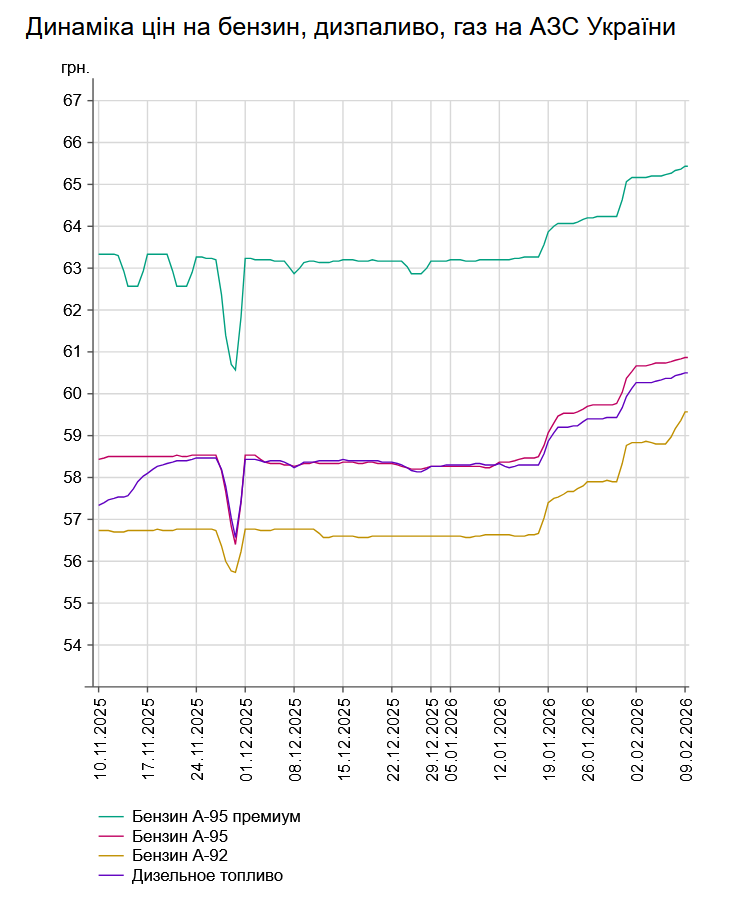 Зокрема, зафіксовано такі середні ціни на пальне: бензин марки А-95 (преміум) - 65,43 грн/л (здорожчав на 10 коп.); бензин марки А-95 - 60,87 грн/л (здорожчав на 7 коп.); бензин марки А-92 - 59,57 грн/л (здорожчав на 39 коп.); дизельне пальне - 60,5 грн/л (здорожчало на 8 коп.). Середня ціна автогазу становить 38,43 грн/л, що на 7 коп. дорожче порівняно із попереднім робочим днем - 6 лютого.