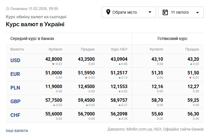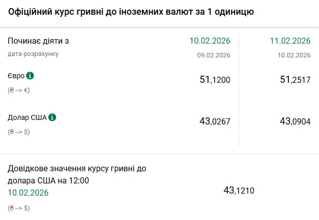 - 1 долар США – 43,09 грн (43,02 грн станом на 10 лютого)