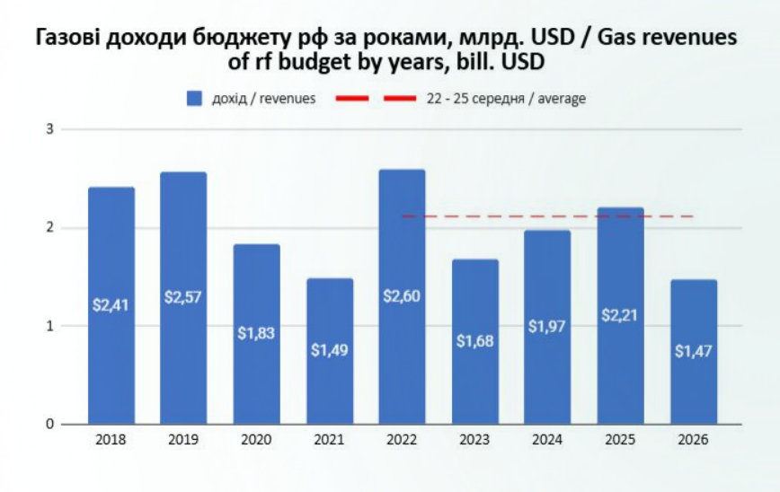 "Трубопровідні поставки «Газпрому» скоротилися з 85 млн куб. м/добу у 2024 році до 46 млн млн куб. м/добу у 2025 році. Частка «Газпрому» в імпорті газу ЄС знизилась з 9% до 5%", - йдеться у звіті.
