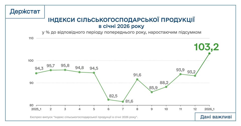 За даними відомства, індекс сільськогосподарської продукції у господарствах усіх категорій населення у січні становив 103,2% до відповідного періоду минулого року за рахунок продукції тваринництва. Зокрема, на підприємствах виробництво зросло на 11,9% (111,9%), тоді як у господарствах населення скоротилося на 15% (85%).