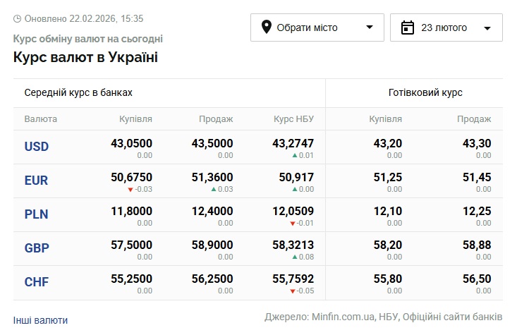 - 1 долар США – 43,27 грн (43,26 грн станом на 20 лютого)