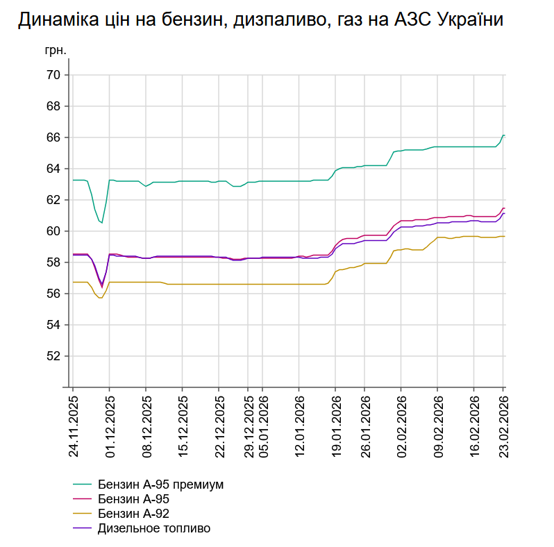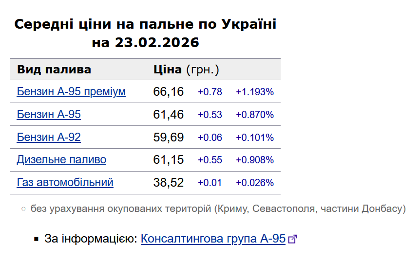 Зокрема, зафіксовано такі середні ціни на пальне: бензин марки А-95 (преміум) - 66,16 грн/л (здорожчав на 78 коп.); бензин марки А-95 - 61,46 грн/л (здорожчав на 53 коп.); бензин марки А-92 - 59,69 грн/л (здорожчав на 6 коп.); дизельне пальне - 61,15 грн/л (здорожчало на 55 коп.). Середня ціна автогазу становить 38,52 грн/л, що на 1 коп. більше порівняно із ціною попереднього робочого дня - 20 лютого.
