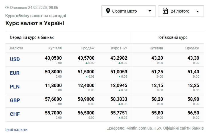 - 1 долар США – 43,29 грн (43,27 грн станом на 23 лютого)