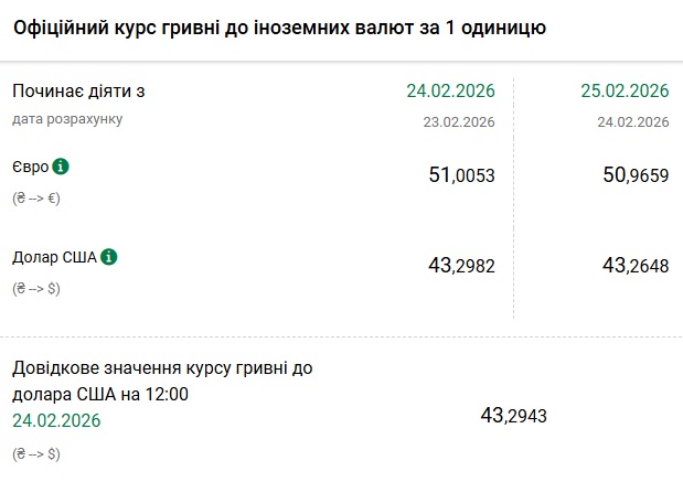 - 1 долар США – 43,26 грн (43,29 грн станом на 24 лютого)