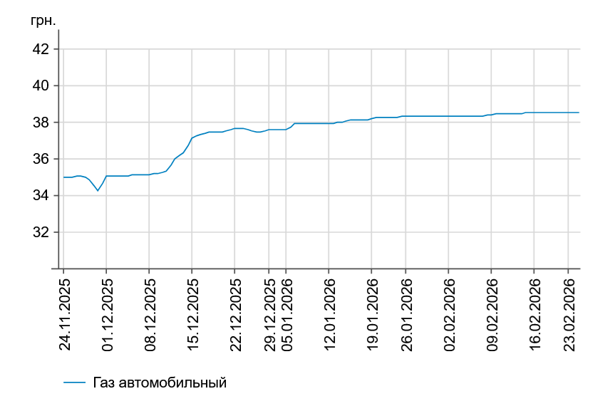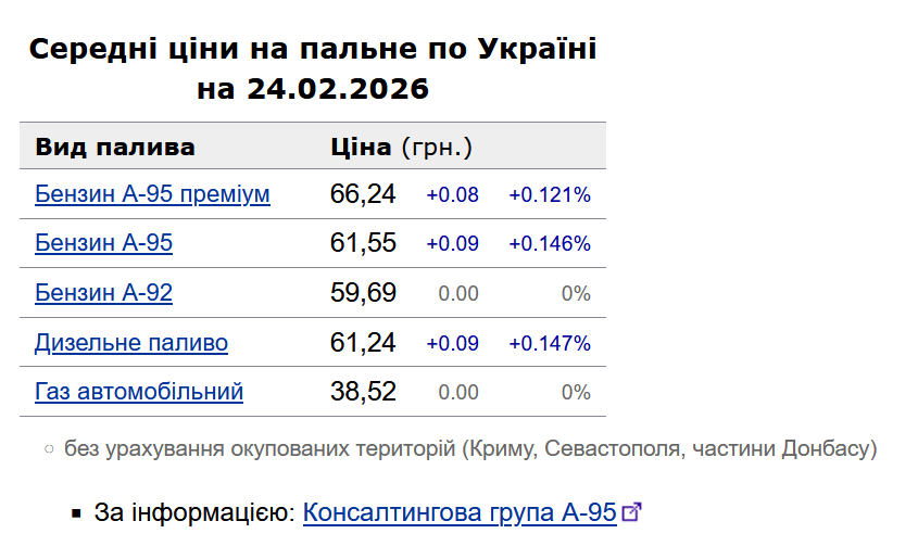 Як повідомлялось, у понеділок, 23 лютого, середня ціна на бензин марки А-95 зросла на 53 коп. до 61,46 грн/л, на дизельне пальне - на 55 коп. до 61,15 грн/л.