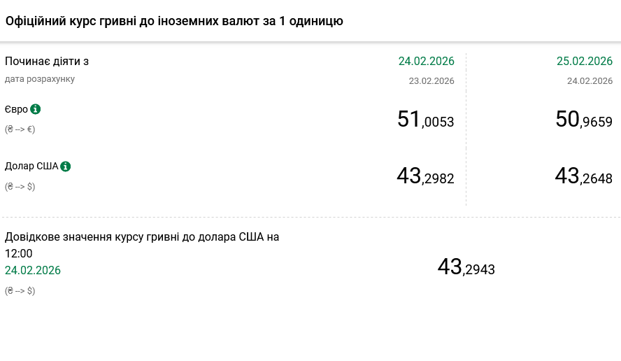 1 долар США – 43,26 грн (43,29 грн станом на 24 лютого);
