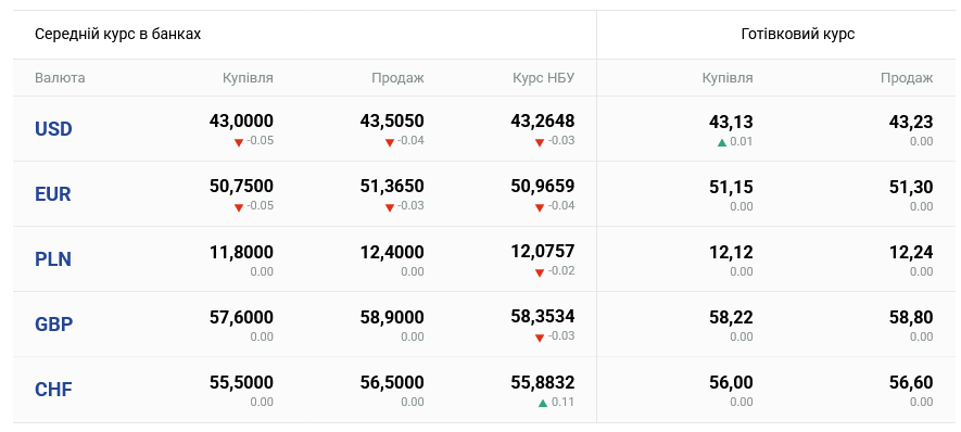 у monobank: 43,01 – 43,47 грн/$ та 50,65 – 51,27 грн/EUR.