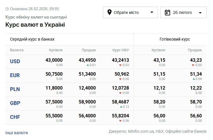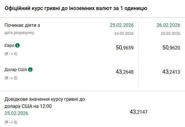 - 1 долар США – 43,24 грн (43,26 грн станом на 25 лютого)