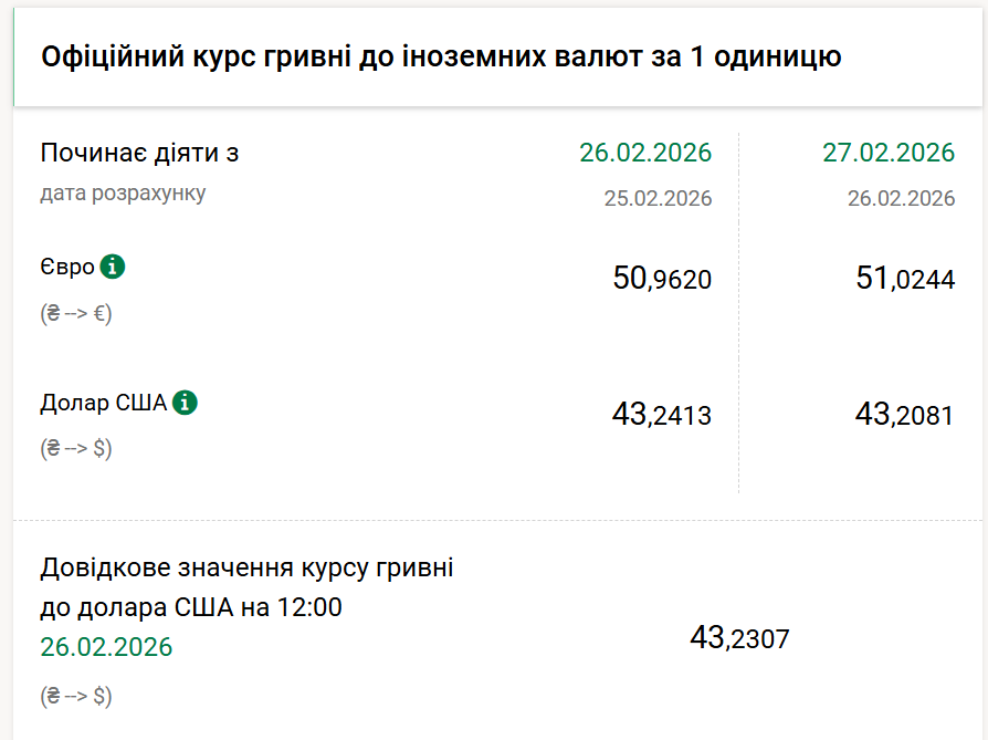 1 долар США – 43,20 грн (43,24 грн станом на 26 лютого);