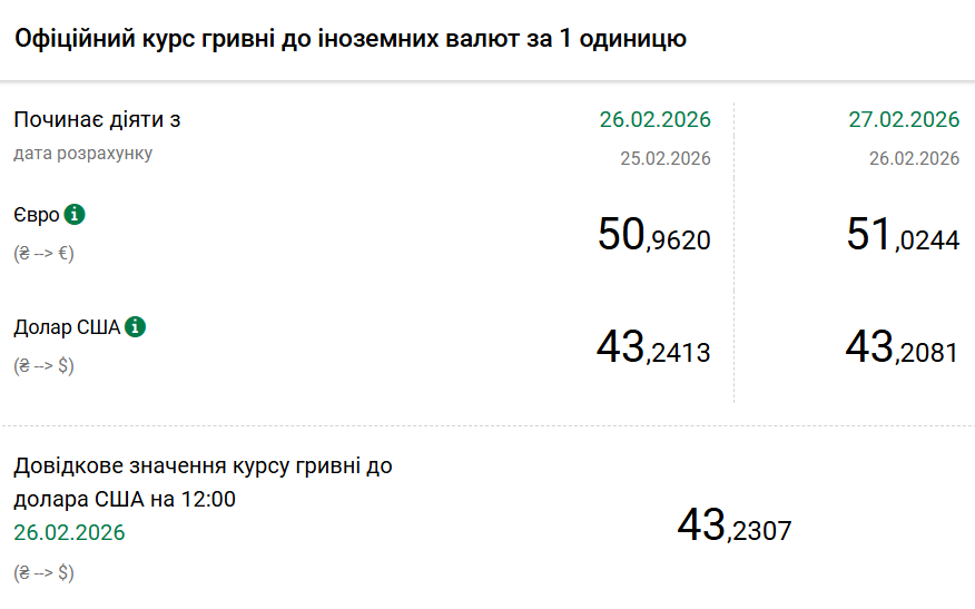 - 1 долар США – 43,20 грн (43,24 грн станом на 26 лютого);