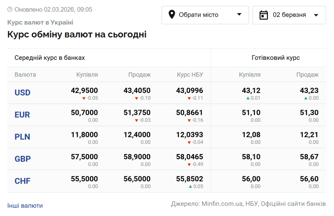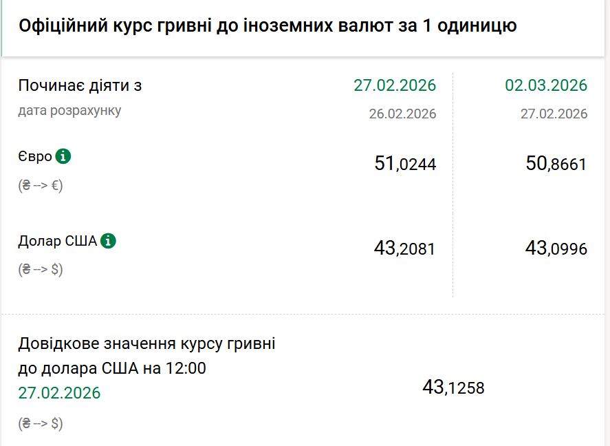 - 1 долар США – 43,09 грн (43,20 грн станом на 27 лютого);