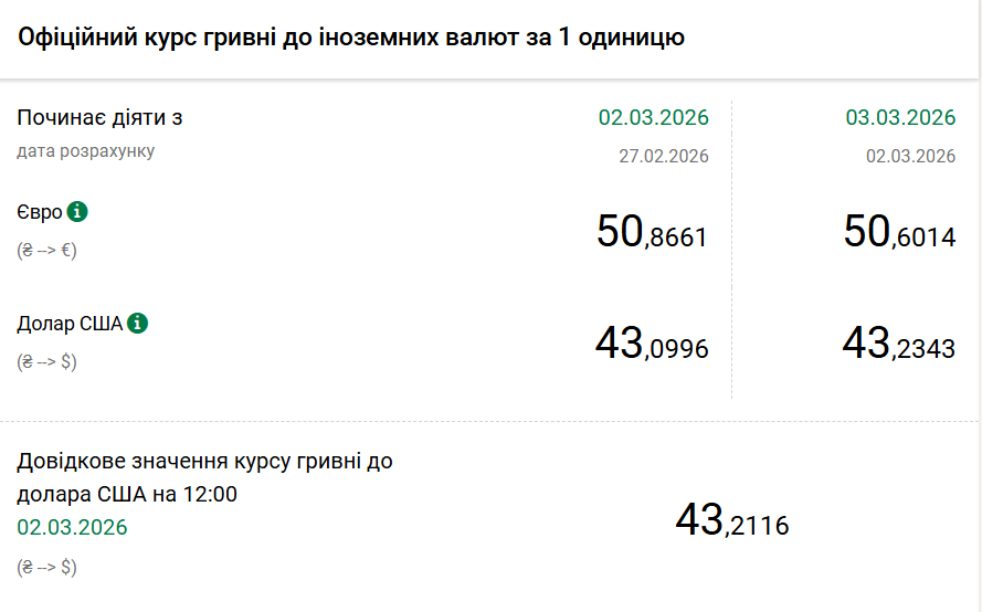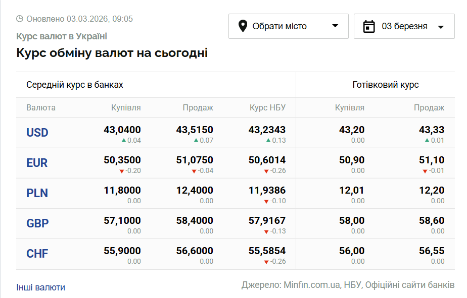 - 1 долар США – 43,23 грн (43,09 грн станом на 2 березня);