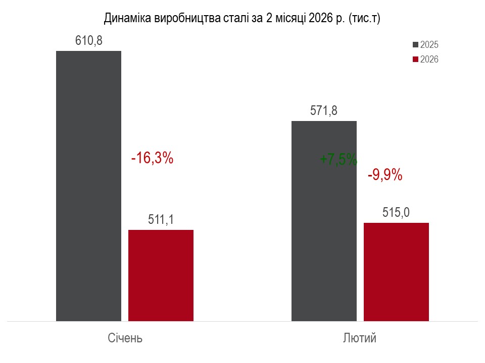 Найбільшого скорочення зазнало виробництво прокату – на 16,8%, з 957 тис. т за два місяці 2025 року до 797 тис. т у січні – лютому поточного року. Зокрема у лютому відносно січня падіння склало 4%.