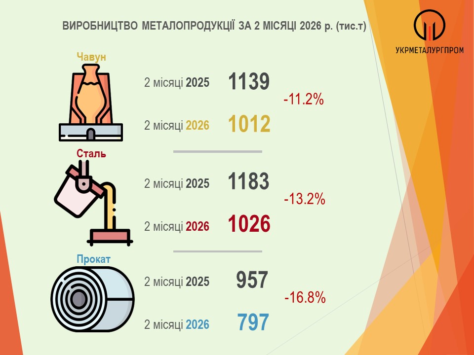 Згідно з оприлюдненими даними, у січні – лютому 2026 року в Україні вироблено 1,01 млн т чавуну, що на 11,2% менше показника за аналогічний період минулого року. У порівнянні з січнем його обсяги у лютому зменшилися на 16%.
