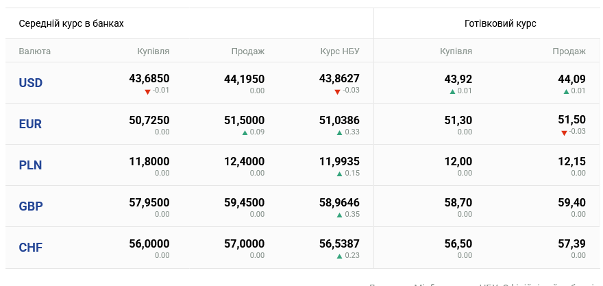 у monobank: 43,67 – 44,03 грн/$ та 50,78 – 51,48 грн/EUR.