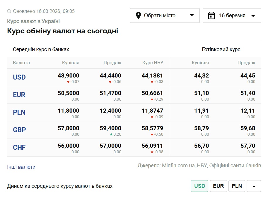 - 1 долар США – 44,13 грн (44,16 грн станом на 13 березня)
