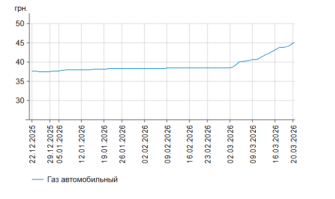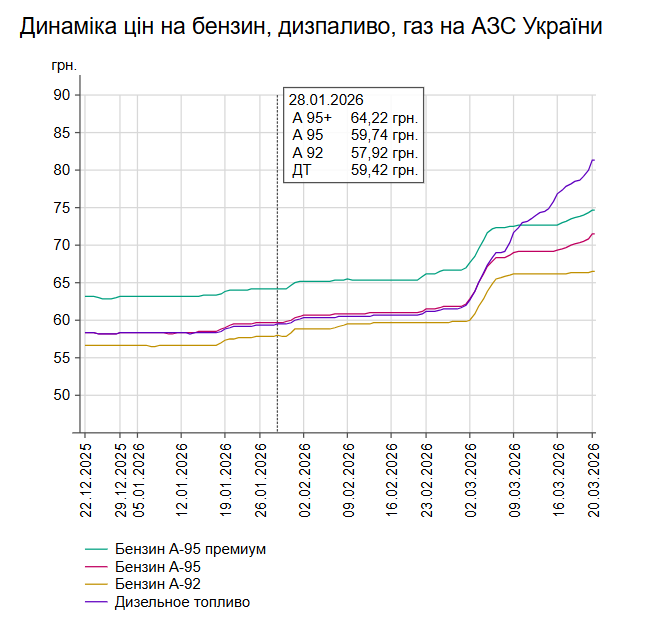 Зокрема, 20 березня зафіксовано такі середні ціни на пальне: бензин марки А-95 (преміум) - 74,65 грн/л (здорожчав на 61 коп.); бензин марки А-95 - 71,46 грн/л (здорожчав на 97 коп.); бензин марки А-92 - 66,69 грн/л (здорожчав на 22 коп.), дизпальне - 81,45 грн/л (здорожчало на 2 грн 09 коп). Середня ціна автогазу становить 44,92 грн/л, що на 80 коп. дорожче порівняно з попереднім днем.
