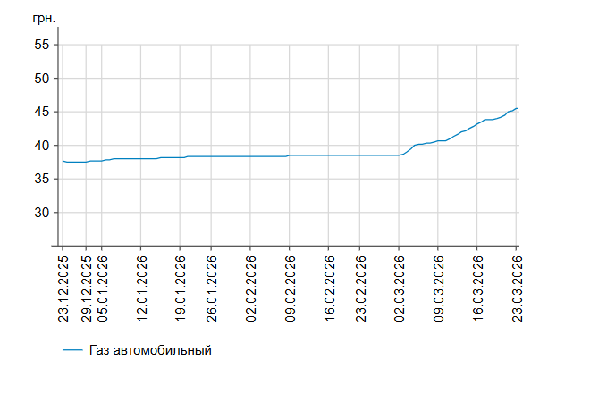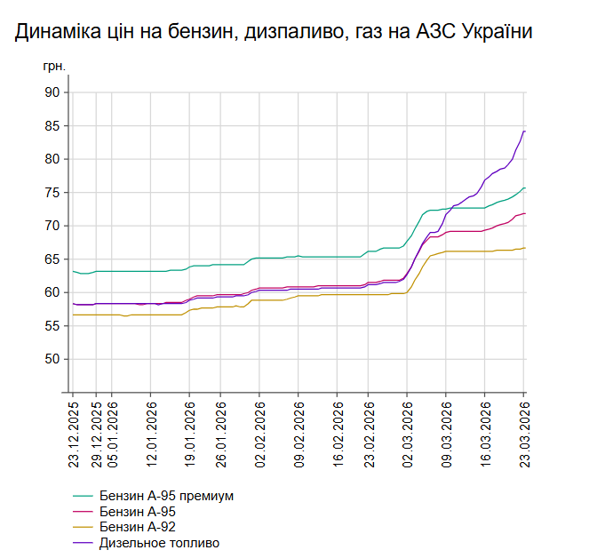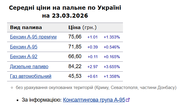 Зокрема, 23 березня зафіксовано такі середні ціни на пальне: бензин марки А-95 (преміум) - 75,66 грн/л (здорожчав на 1 грн 01 коп.); бензин марки А-95 - 71,85 грн/л (здорожчав на 39 коп.); бензин марки А-92 - 66,6 грн/л (здорожчав на 11 коп.), дизпальне - 84,22 грн/л (здорожчало на 2 грн 97 коп). Середня ціна автогазу становить 45,53 грн/л, що на 61 коп. більше порівняно з попереднім днем.
