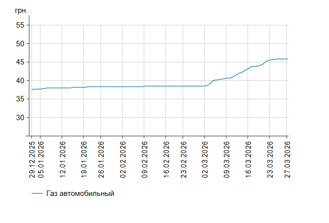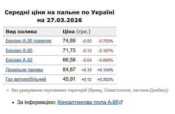 Як повідомлялось, у четвер, 26 березня, середня ціна на бензин марки А-95 зафіксувалася на рівні 71,85 грн/л, на дизельне пальне - знизилася на 11 коп. до 84,54 грн/л.