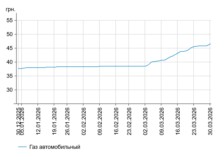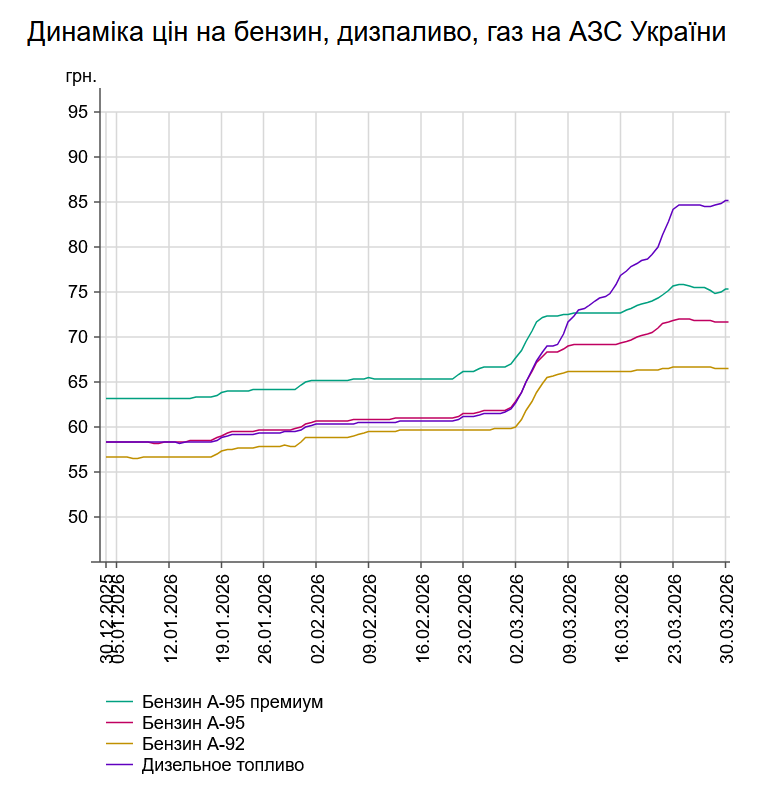 Зокрема, зафіксовано такі середні ціни на пальне: бензин марки А-95 (преміум) - 75,41 грн/л (здорожчав на 52 коп.); бензин марки А-95 - 71,73 грн/л; бензин марки А-92 - 66,56 грн/л (здешевшав на 2 коп.), дизпальне - 85,23 грн/л (здорожчало на 56 коп). Середня ціна автогазу становить 46,54 грн/л, що на 63 коп. дорожче порівняно з попереднім робочим днем - 27 березня.