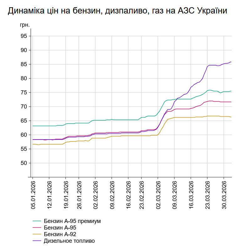 Як повідомлялось, у вівторок, 31 березня, середня ціна на бензин марки А-95 знизилася на 2 коп. до 71,71 грн/л, на дизельне пальне - зросла на 16 коп. до 85,39 грн/л.