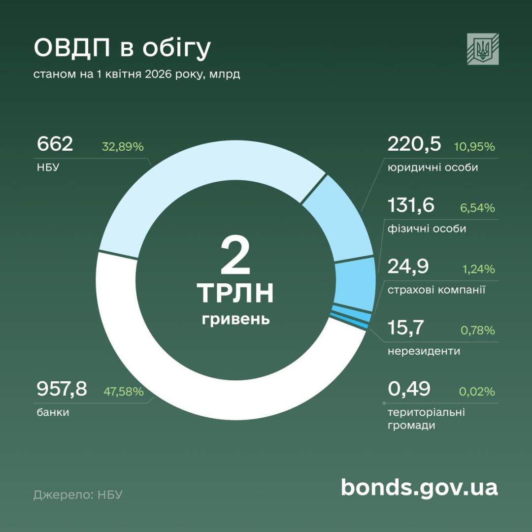 Станом на 1 квітня 2026 року в обігу перебувають державні облігації на понад 2,08 трлн гривень. Найбільшу частку портфеля утримують комерційні банки — 47,58%, далі — Національний банк України — 32,89%. Частки інших інвесторів становлять: юридичні особи — 10,96%, фізичні особи — 6,54%, страхові компанії — 1,24%, нерезиденти — 0,78% та територіальні громади — 0,02%.