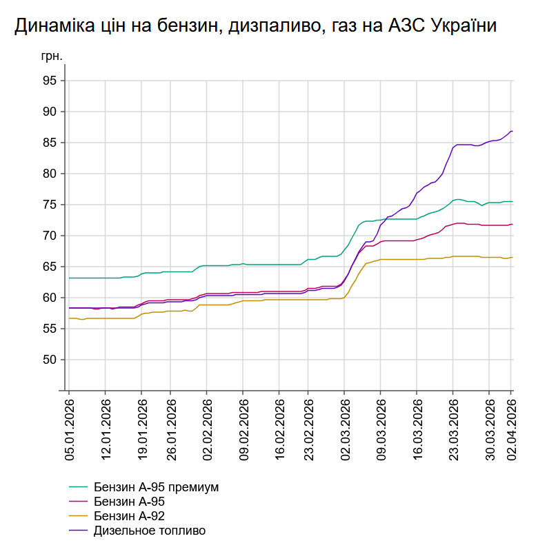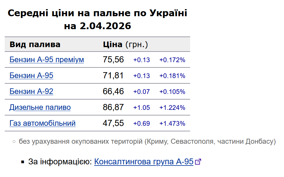 Зокрема, зафіксовано такі середні ціни на пальне: бензин марки А-95 (преміум) - 75,56 грн/л (здорожчав на 13 коп.); бензин марки А-95 - 71,81 грн/л (здорожчав на 13 коп.); бензин марки А-92 - 66,46 грн/л (здорожчав на 7 коп.), дизпальне - 86,87 грн/л (здорожчало на 1,05 грн). Середня ціна автогазу становить 47,55 грн/л, що на 69 коп. дорожче порівняно з попереднім днем.