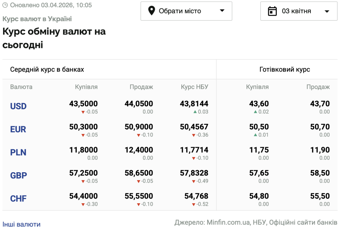 - 1 долар США – 43,81 грн (43,78 грн станом на 2 квітня);