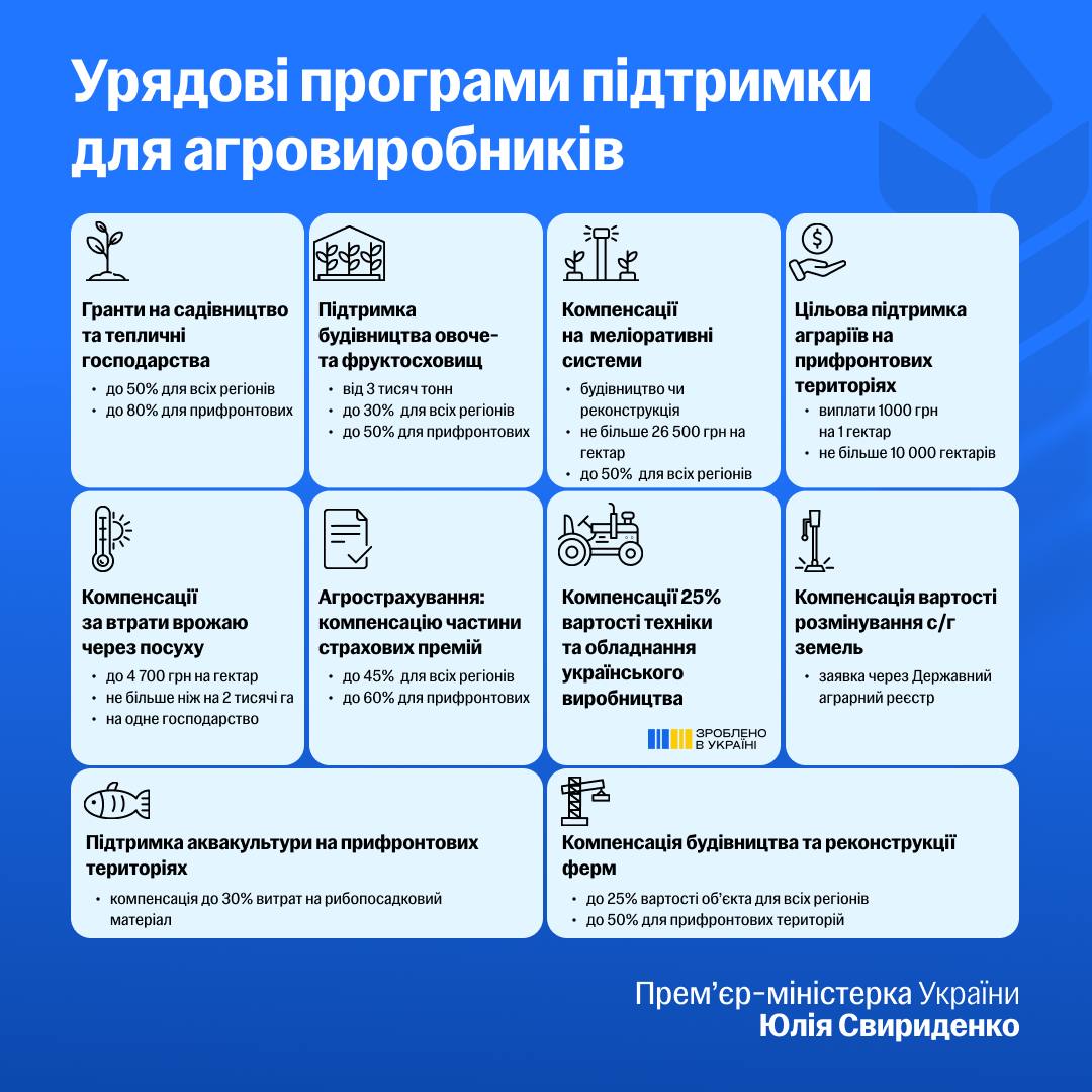 Уряд продовжує підтримувати українських агровиробників, зазначила Свириденко.