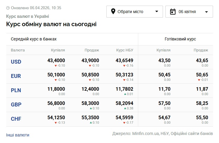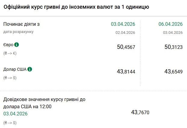 - 1 долар США – 43,65 грн (43,81 грн станом на 3 квітня)
