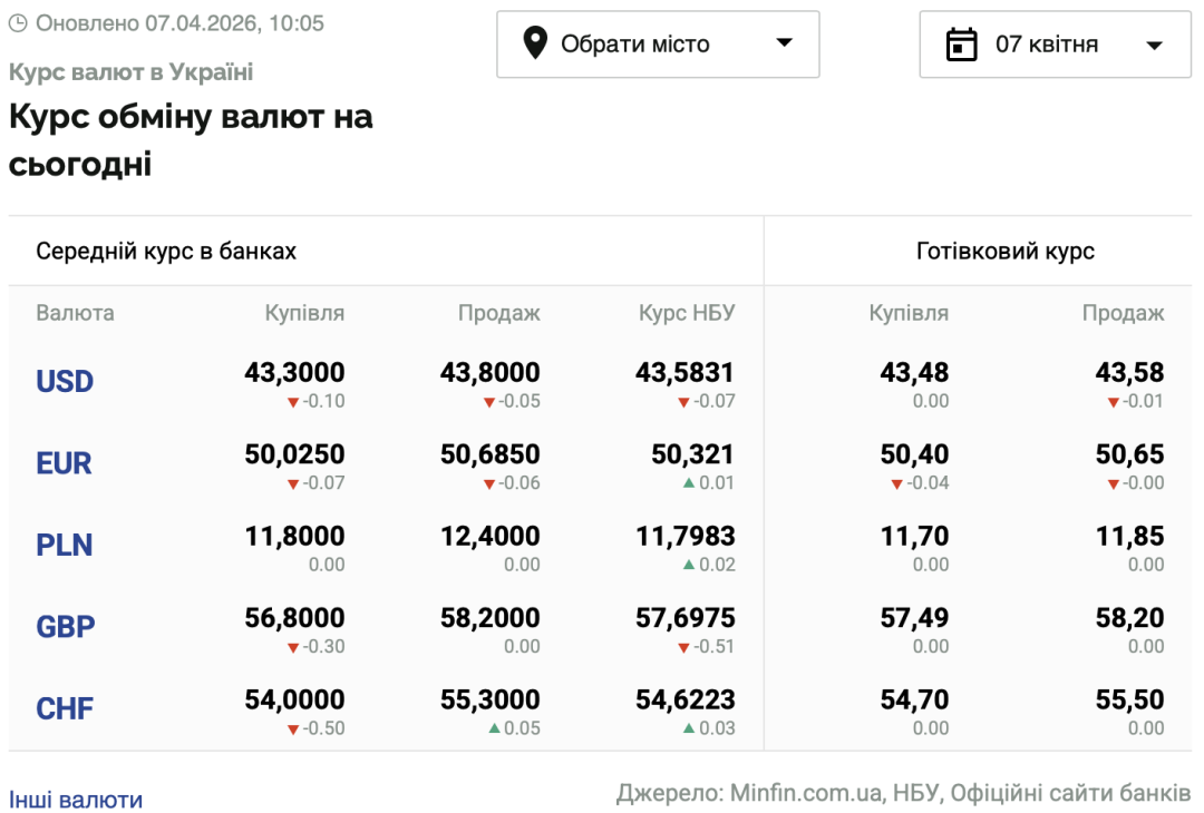 - 1 долар США – 43,58 грн (43,65 грн станом на 6 квітня);