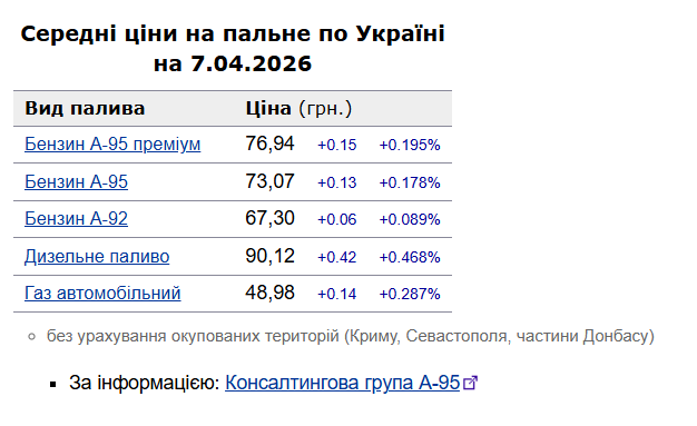 Як повідомлялось, у понеділок, 6 квітня, середня ціна на бензин марки А-95 зросла на 1 грн 11 коп. до 72,94 грн/л, на дизельне пальне - на 2 грн 7 коп. до 89,7 грн/л.