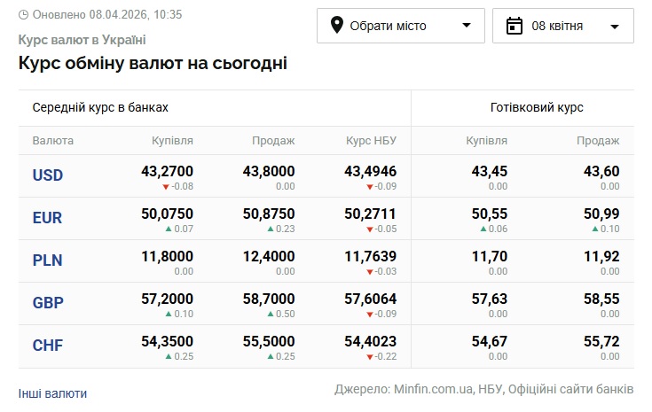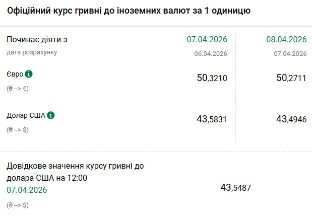 - 1 долар США – 43,49 грн (43,58 грн станом на 7 квітня)