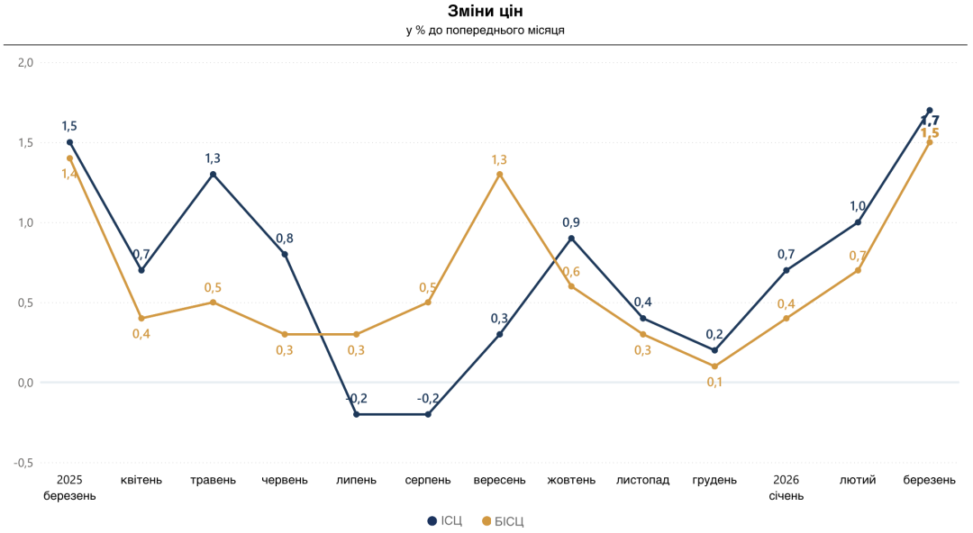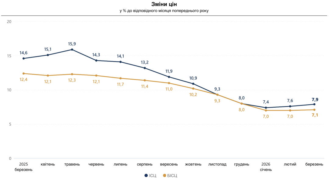 «Інфляція на споживчому ринку в березні 2026 році порівняно із лютим становила 1,7%, із березнем 2025 року – 7,9%. Базова інфляція в березні 2026 року порівняно із лютим становила 1,5%, із березнем 2025 року – 7,1%», - йдеться в повідомленні.